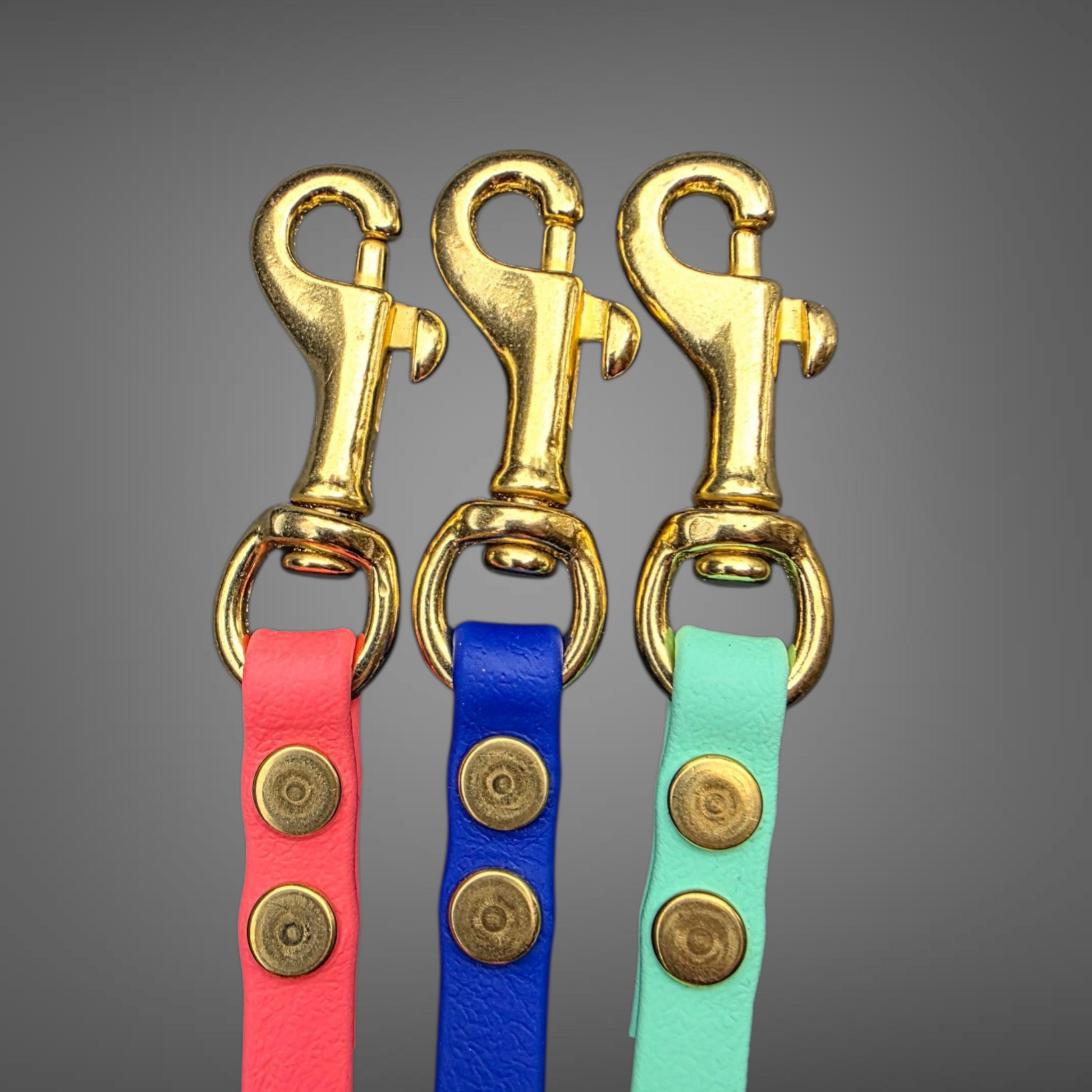 Enjoy walks with your toy-sized dog with this 3/8" wide BioThane® leash available in 50 vibrant colors, solid brass hardware, and many different length options. BioThane® is a flexible, durable, easy-to-clean alternative to leather. A matching solid brass d-ring is added to the handle of all leashes for poop bags.