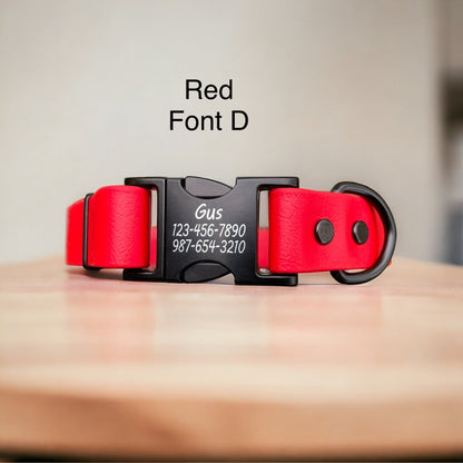 Accessorize your dog with this handmade BioThane® collar with engraved metal quick release buckle available in a 3/4" and 1" widths. The buckle is made of zinc with a matte black finish with your dog’s name and contact information engraved on the buckle in your choice of four fonts. Pair the buckle with one of 50 vibrant colors of BioThane® webbing. BioThane® is a flexible, durable, easy-to-clean alternative to leather available in many colors. The length is adjustable to allow for a perfect fit. Note: All-metal quick-release buckles do require less force to open than plastic or metal/plastic hybrid buckles due to how they are constructed. If you are looking for an engraved collar that requires more force to open, a metal/plastic hybrid collar can be found at the following listing: BioThane® Dog Collar with Engraved Metal/Plastic Side Release Buckle – Rubysaurus Creations.